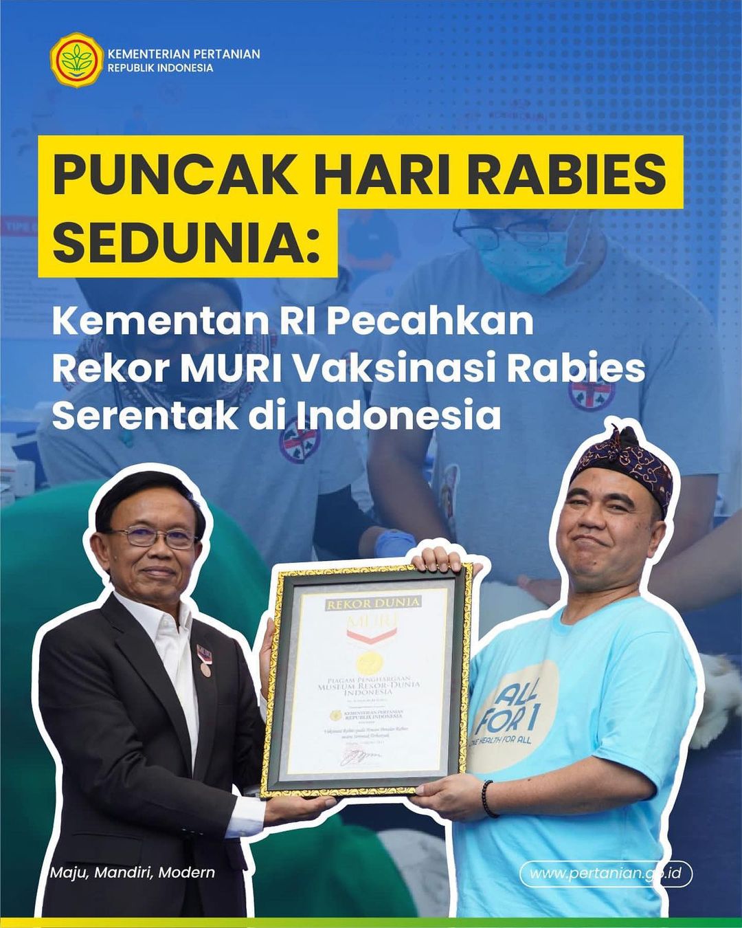 SobaTani, pada Puncak Peringatan Hari Rabies Sedunia / World Rabies Day Tahun 2023, Kementerian Pertanian bekerjasama dengan Pemerintah Jawa Barat berhasil memecahkan Rekor MURI (Museum Rekor Dunia Indonesia) dengan melakukan Vaksinasi Hewan Penular Rabies Serentak Terbanyak yang diadakan di Gedung Sate, Bandung pada Sabtu, (7/10) lalu.
